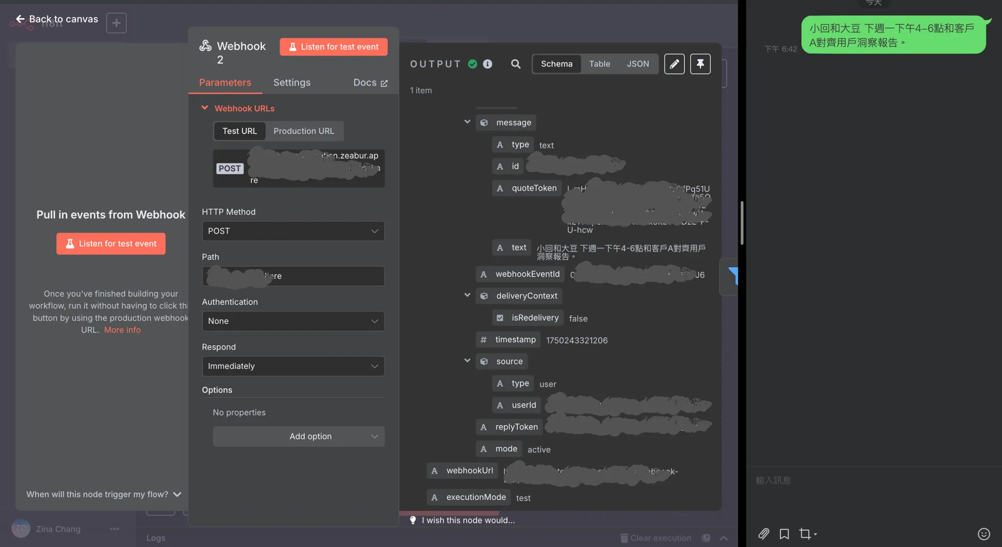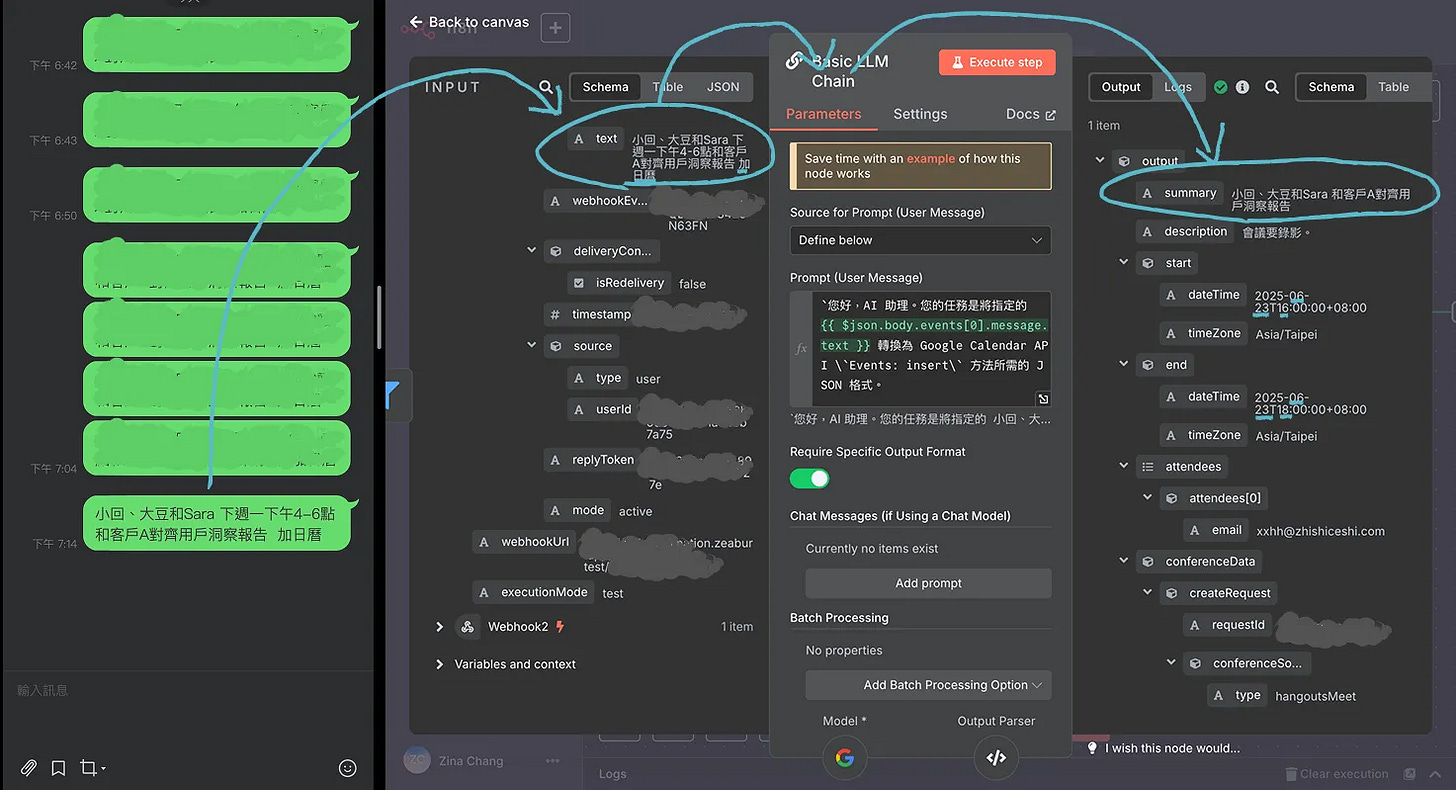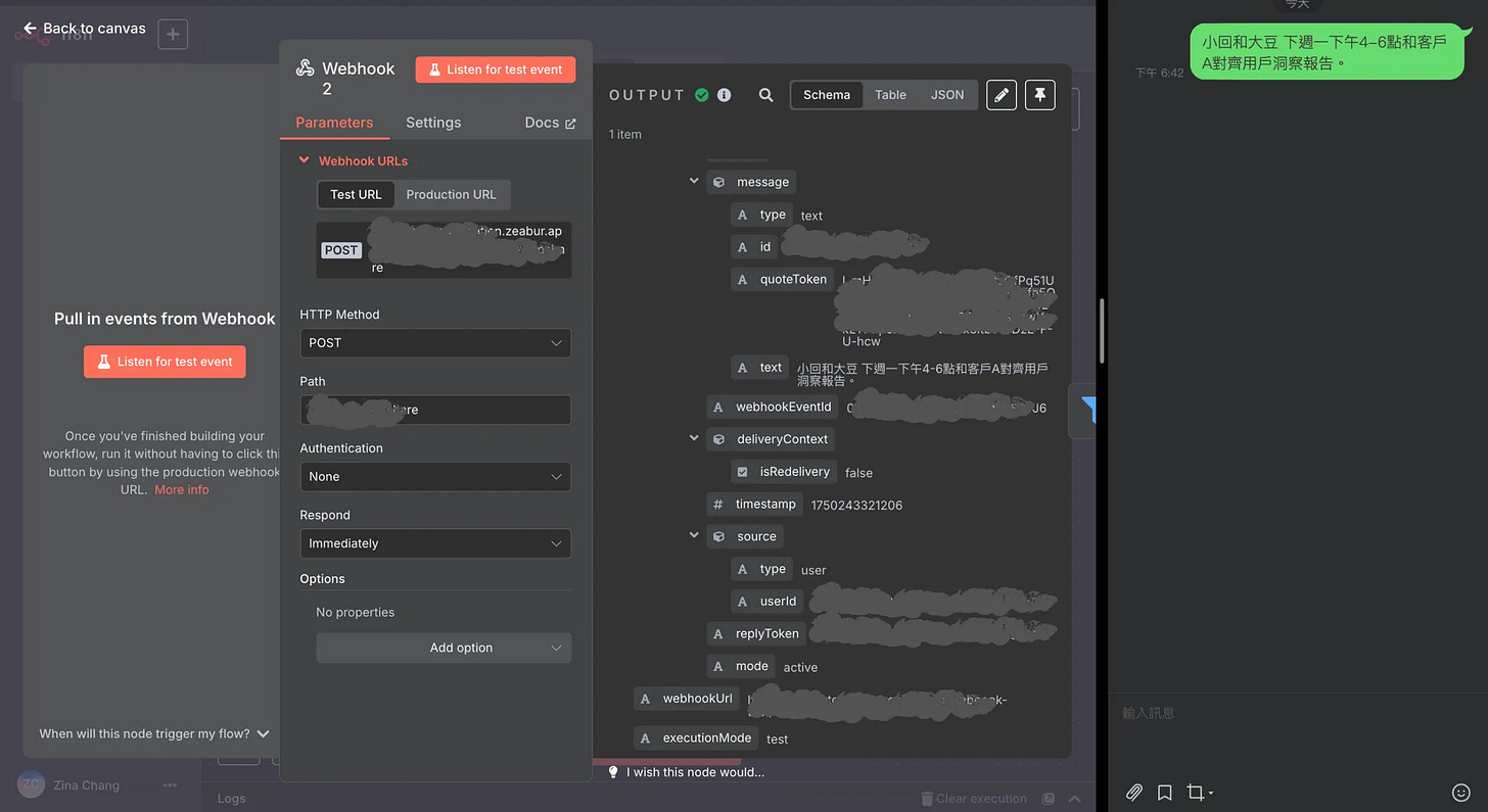 測試流程:先點擊n8n橘色「Listen for test event」,Line再送出測試文字「加日曆 小回和大豆 下週一下午4-6點和客戶A對齊用戶報告」。