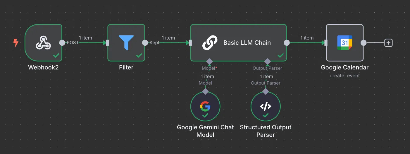 跟 Line 說會議內容 → 【webhook trigger 節點】觸發 n8n 辨識、抓取資訊 → 【filter 節點】判斷有「加日曆」這個咒語 → 【AI 節點】自然語言轉成結構內容 → 【Calendar 節點】結構內容寫進 Google 新增 calendar。