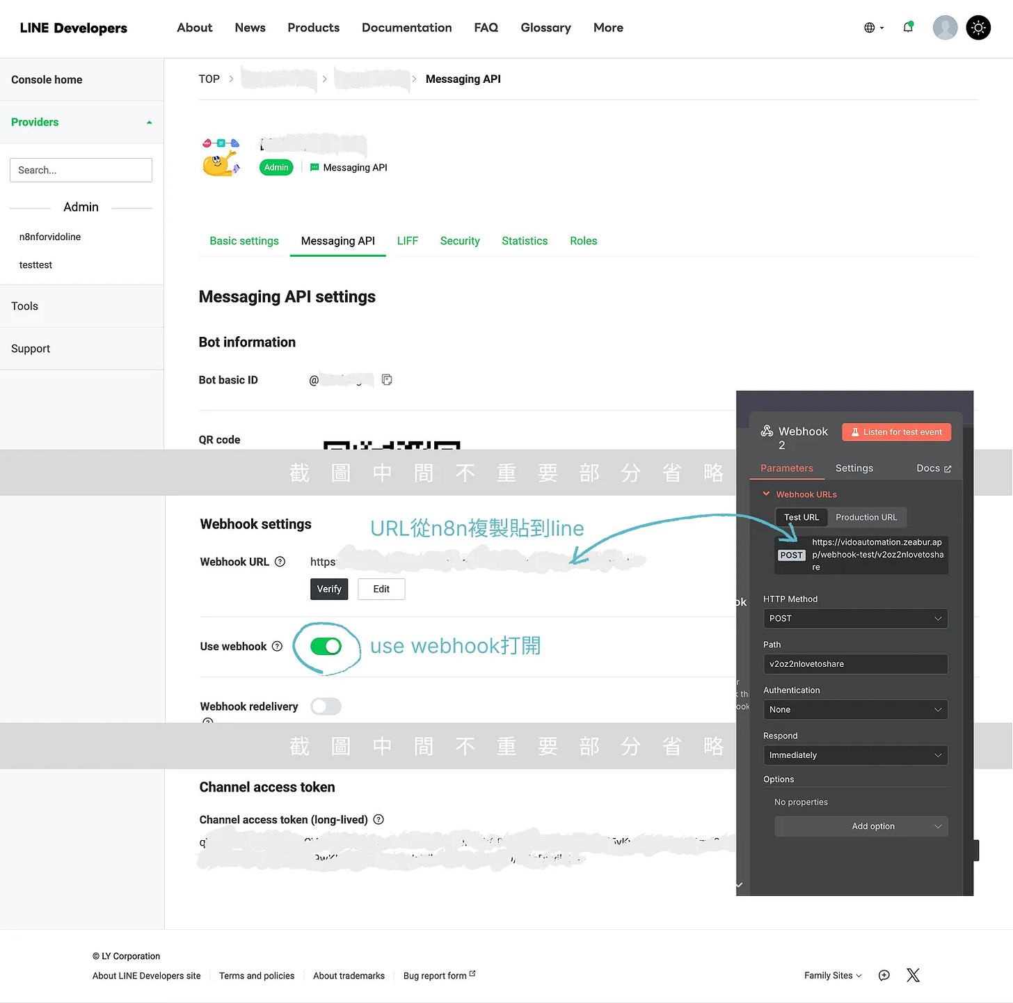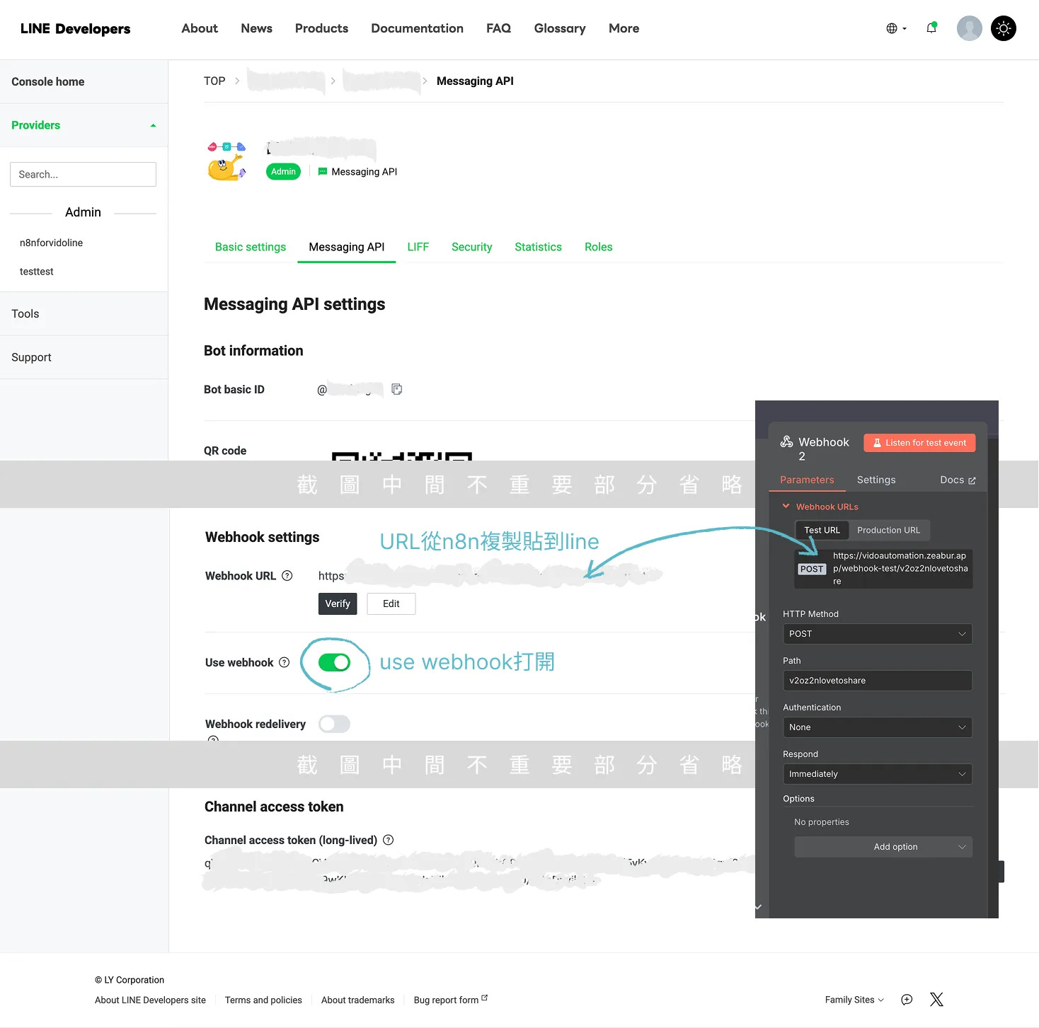複製 n8n wenhook 的 test url,到 Linebot 設定的 Messaging API / Webhook Settings 的 Webhook URL 欄位貼上後,執行測試步驟。