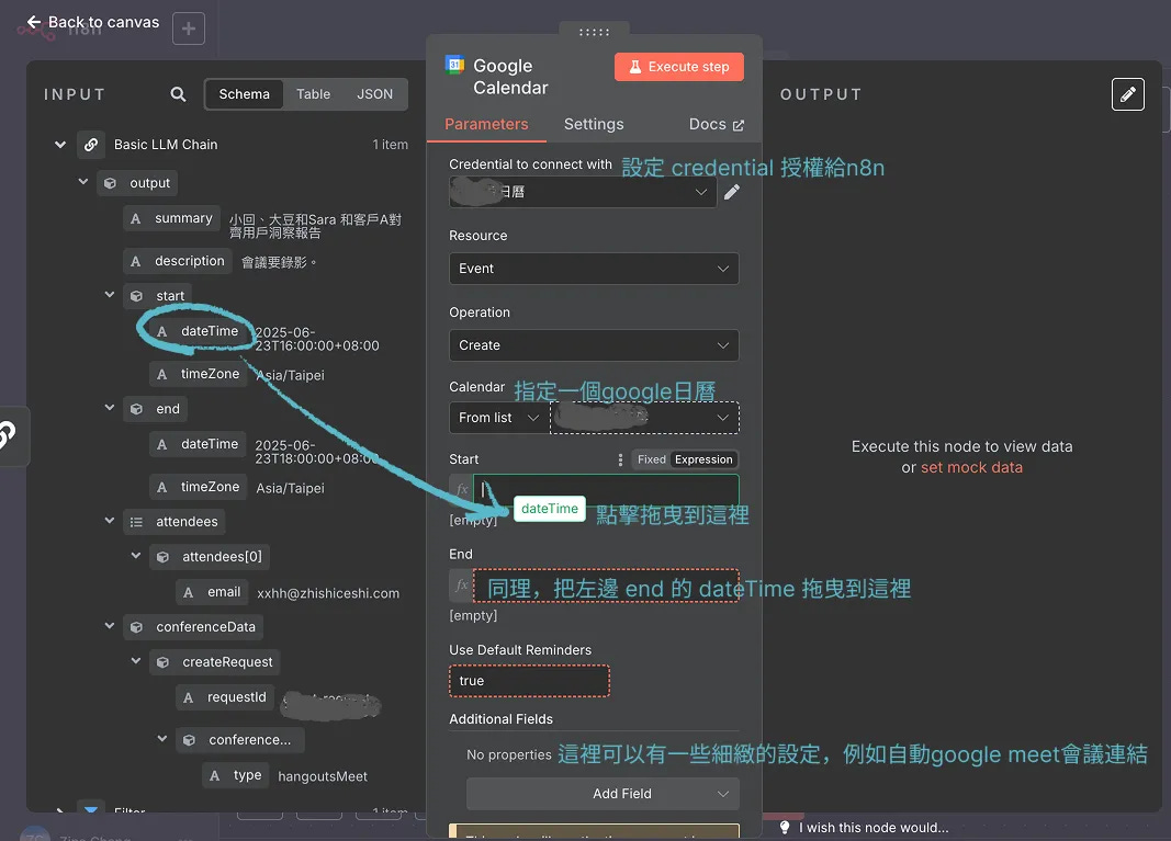 4-1 新增 Google Calendar 節點,並透過拖曳方式配置相關資料。