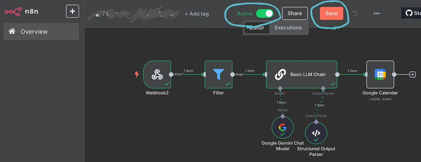 5-1 於 n8n 平台內儲存並啟用 (Active) 該流程