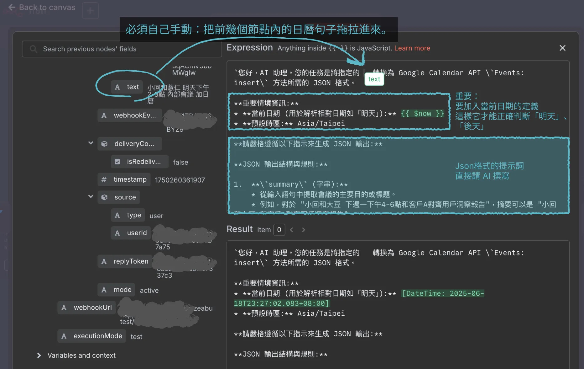 提示詞內要以 $now 指定當前日期、預設時區是台北的時區。