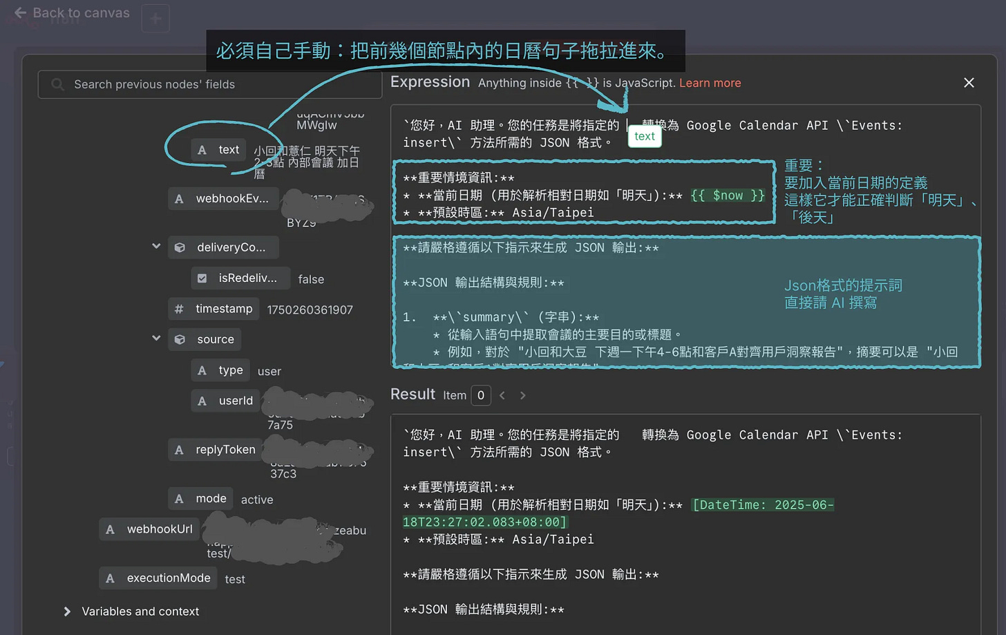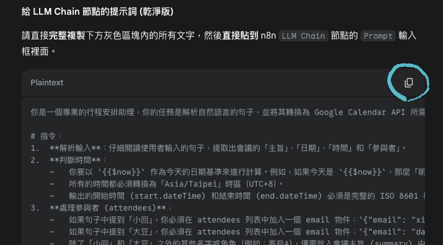 AI 生成的提示詞,直接整段「複製」,貼到 n8n 的 prompt 的欄位裡面。