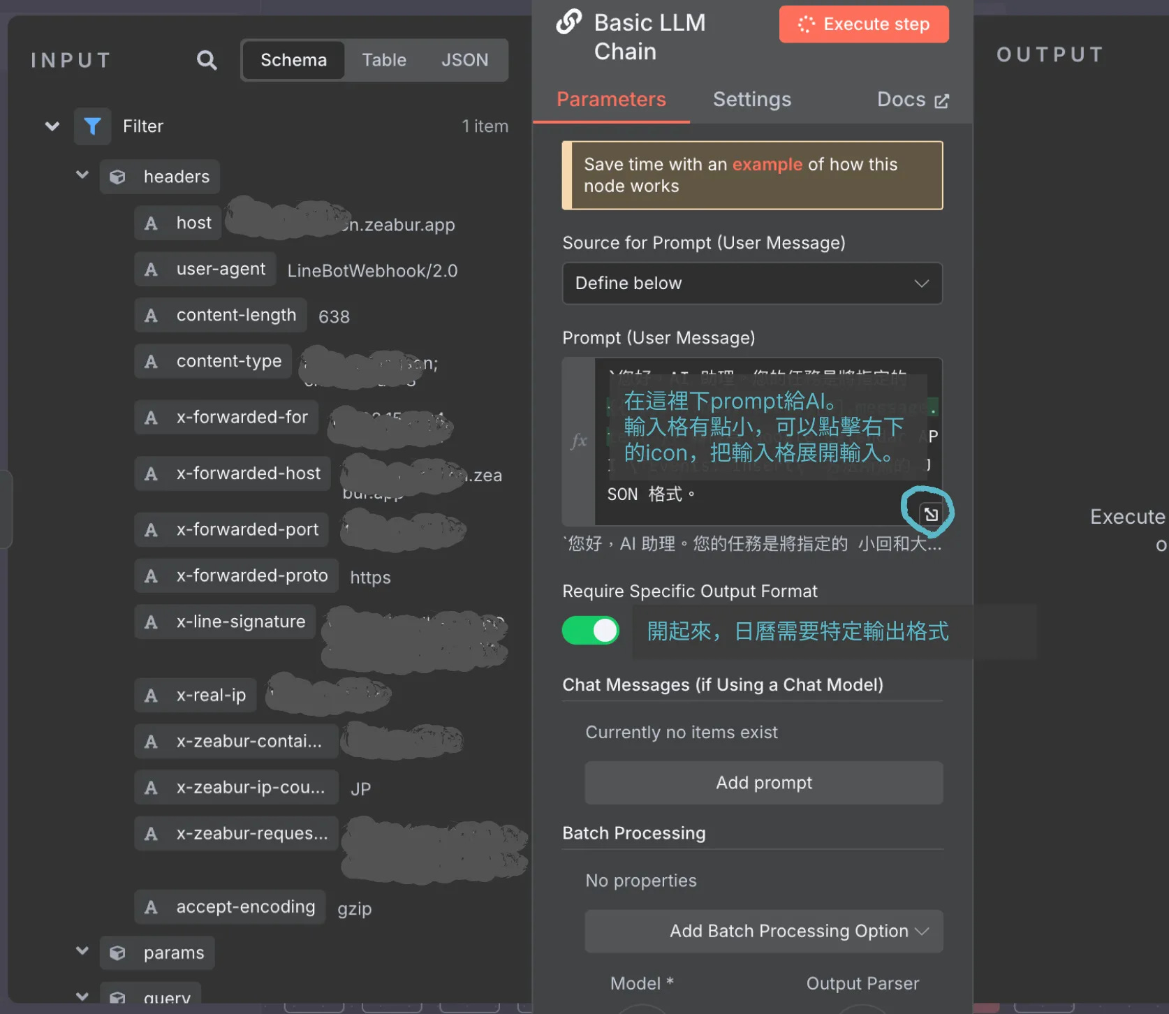 步驟3. 【Basic LLM Chain 節點】把目的明確的自然語言轉成Calendar 格式