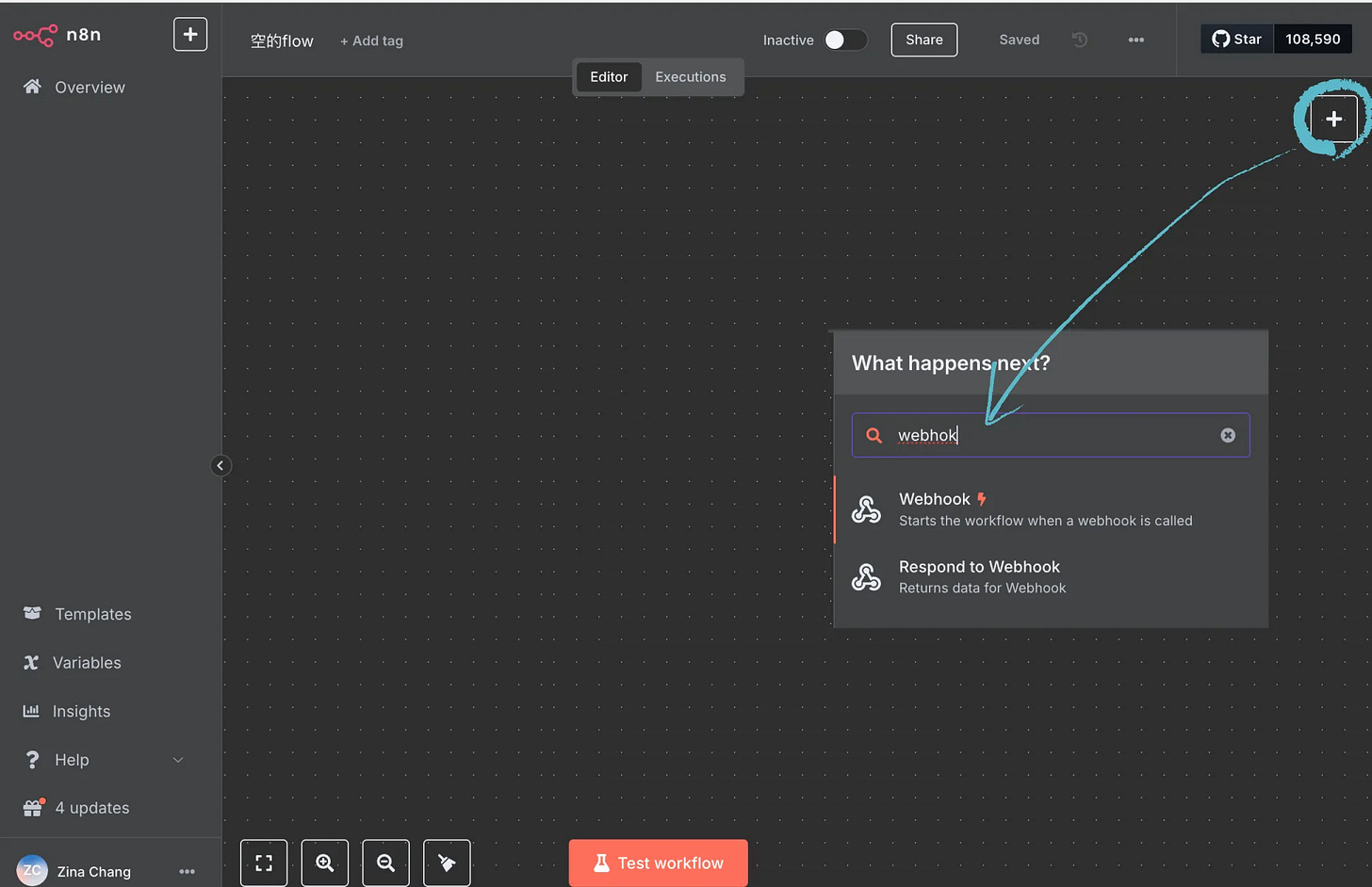 右方加號展開 Node Panel (節點庫)可以搜尋 Webhook,加入後點擊它,會自動出現在工作區。