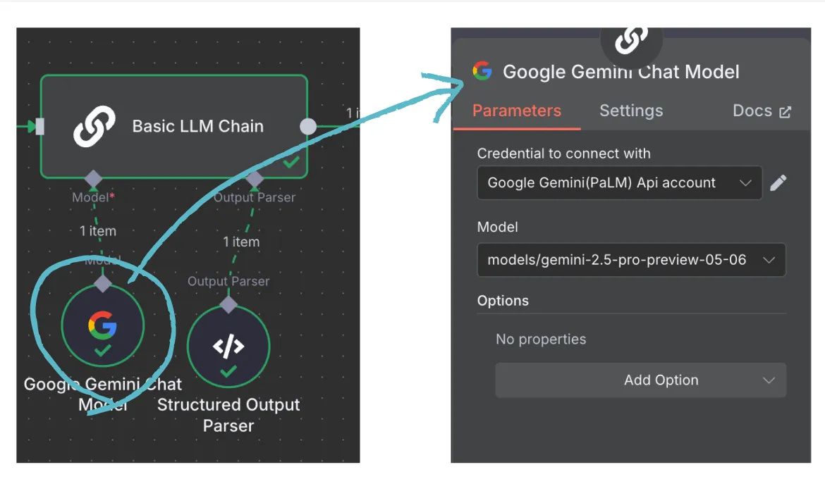 3-4 Basic LLM Chain 下方加入n8n連結的AI模型(我們用gemini)