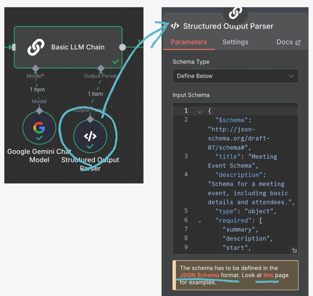 Schema Type選「DefineBelow」然後把 「JSON schema format」 和 n8n的規則頁面提供給 AI,讓它把 3-3 步驟生成的內容調整成新格式,讓你複製貼上。