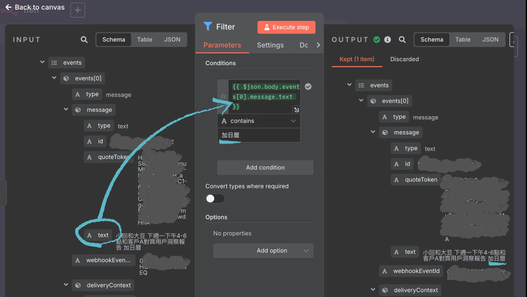 Filter 設定「當輸入的文字包含咒語」的時候,就讓這串資料往下一步走。