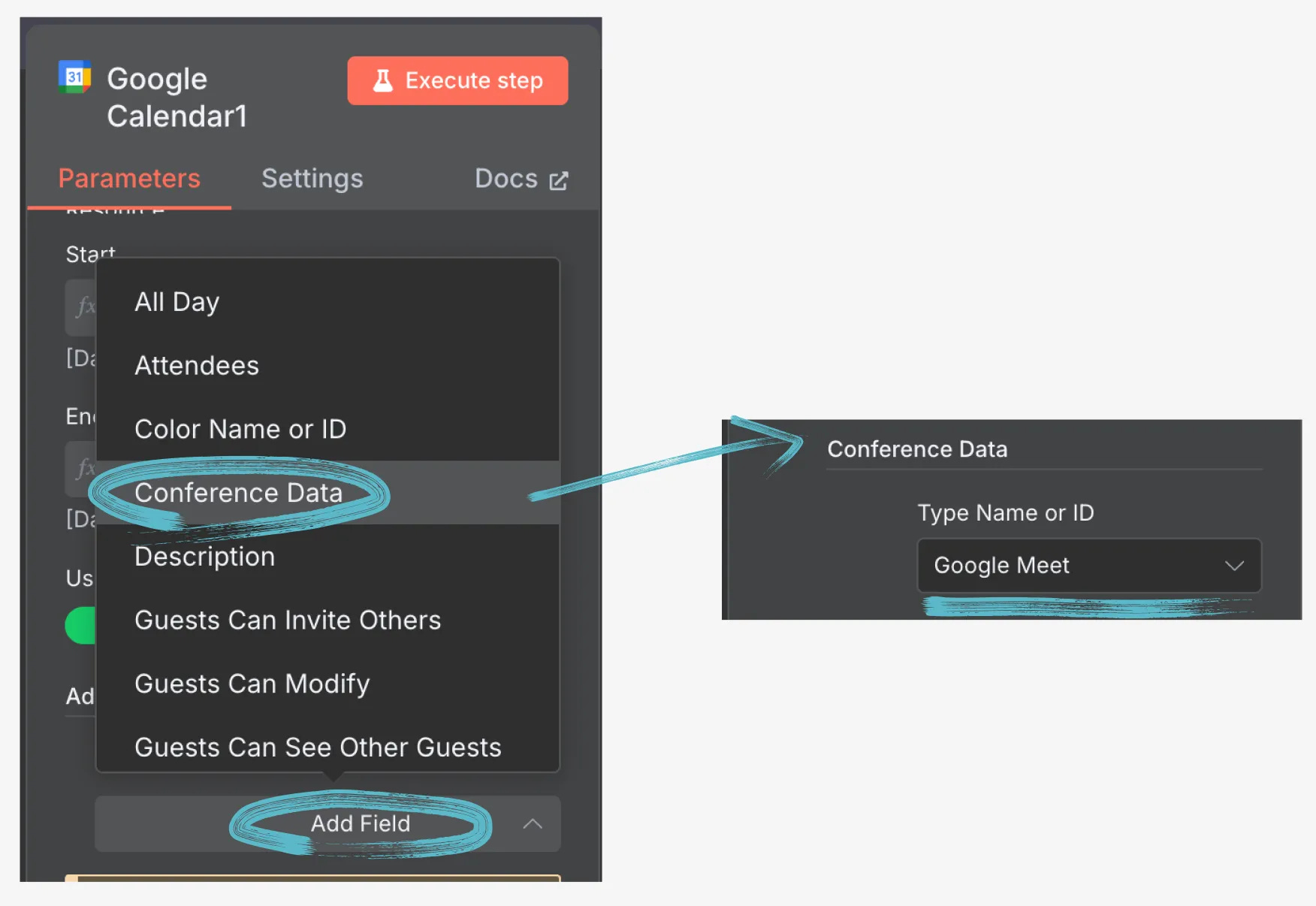 Add Field → 下拉選單內找到 Conference Data → Type Name or ID到下拉選單內只有一個 Google Meet